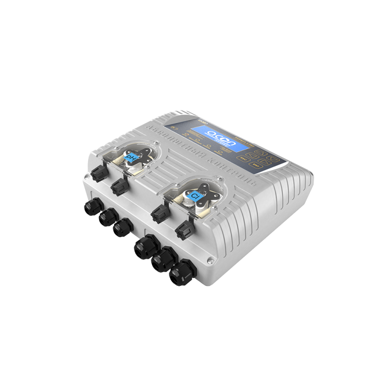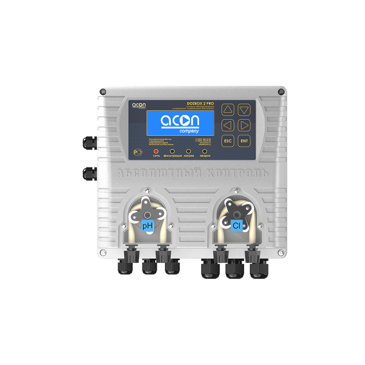 Универсальная станция химической дозации для контроля и поддержания рН (Водородный показатель) и свободного хлора (Cl2) воды плавательных бассейнов объемом от 1 до 250м3. С двумя перистальтическим дозирующими насосами, производительностью 2,2л/ч. Возможно назначение второго дозирующего насоса на любой вид химии для плавательного бассейна (по умолчанию: 1 – рН (не переназначается), 2 – Cl (гипохлорит натрия)).